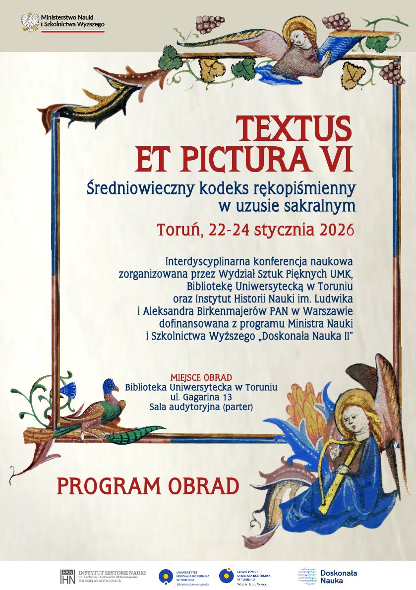 Na stronie konferencji znajduje się się szczegółowy program. Do 5 stycznia możliwa jest rejestracja uczestnictwa bez referatu. Dane do rejestracji: stopień naukowy/tytuł zawodowy, imię i nazwisko oraz afiliację należy przesłać na adres textus_et_pictura@umk.pl. Organizatorzy nie pobierają opłaty konferencyjnej za udział w obradach.