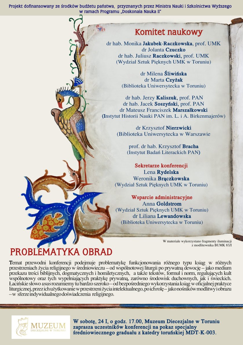 W dniach 22-24 Biblioteka Uniwersytecka w Toruniu po raz szósty będzie gościć uczestników konferencji z cyklu Textus et pictura. Obecna edycja nosi tytuł Średniowieczny kodeks rękopiśmienny w ususie sakralnym. Organizatorami konferencji są: Wydział Sztuk Pięknych UMK, Biblioteka Uniwersytecka w Toruniu oraz Instytut Historii Nauki im. Ludwika i Aleksandra Birkenmajerów PAN w Warszawie.