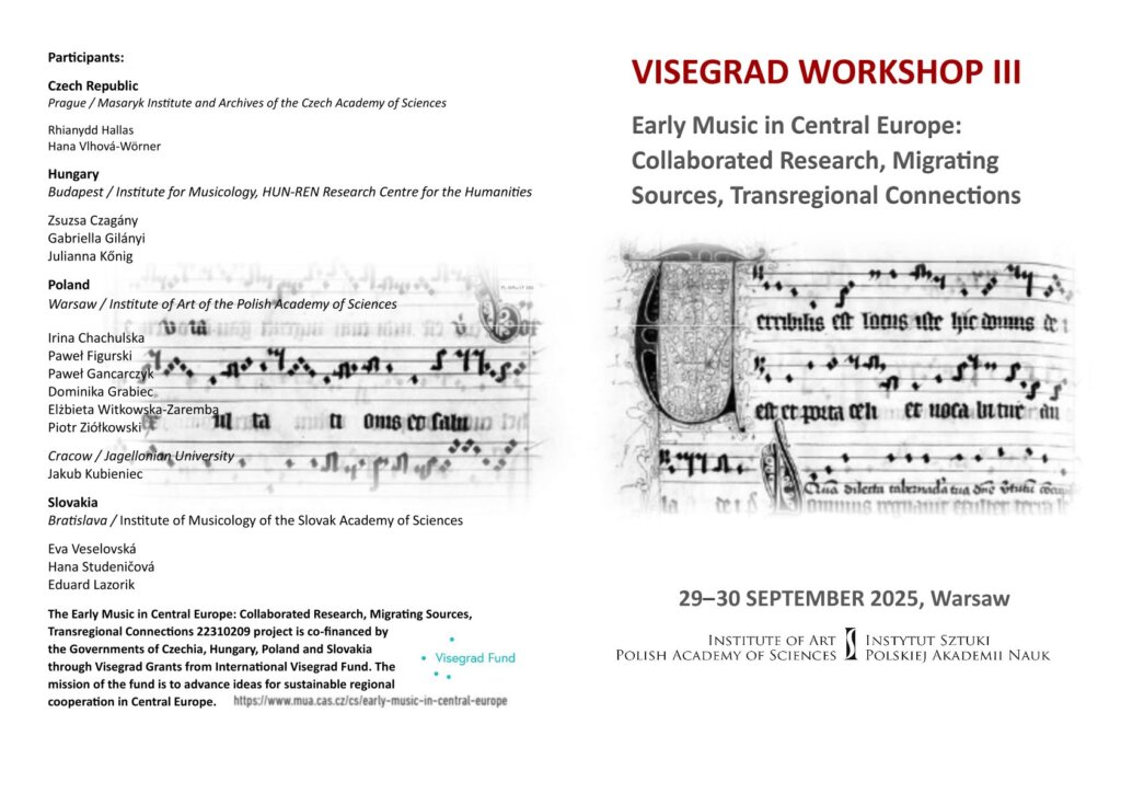 W dniach 29-30 września w Instytucie Sztuki PAN (ul. Długa 26, sala Konferencyjna) odbędzie się warsztat pt. Visegrad Workshop III: The Early Music in Central Europe. Collaborated Research, Migrating Sources, Transregional Connections.