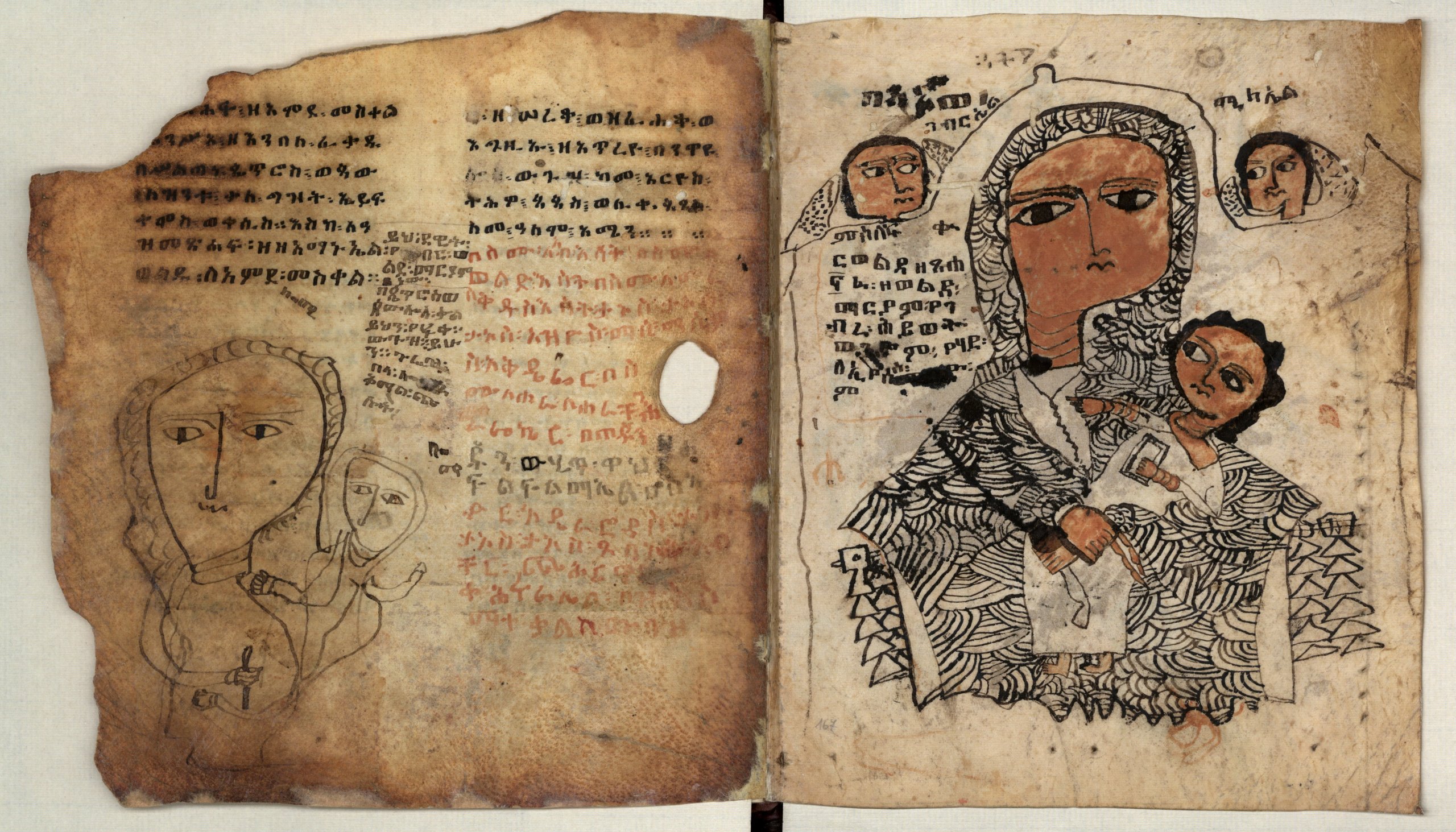 Cztery kolejne kodeksy zawierają teksty religijne. Każdy z nich jest na swój sposób ciekawy: jeden to miniaturka o wymiarach 4,5 x 3 cm (nr inw. 3515), kolejny – nr inw. 3512 zawiera notację muzyczną; nr inw 3514 zawiera poezje, w tym przykład popularnego w Etiopii poematu zwanego mälkə. Utwory tego typu opierają się na interesującym, chociaż z perspektywy Europejczyków zaskakującym, koncepcie; otóż zawierają pochwały poszczególnych części ciała wybranego świętego. Pierwsza strofa opiewa najwyższe partie ciała (włosy, głowę), a kolejne elementy stopniowo coraz niższe partie. Ostatni z prezentowanych rękopisów nr inw. 3513 zawiera zbiór bardzo różnorodnych tekstów przepisywanych w różnych okresach i prawdopodobnie przez różne osoby; była to zapewne podręczny zestaw najprzydatniejszych modlitw, zaklęć i tekstów dywinacyjnych używany na co dzień przez – być może jakiegoś debterę.